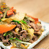 Thịt bò thái mỏng, ướp với 1 tbsp dầu hào, 1 tsp gia vị, 1/4 tsp tiêu bột, 1 tbsp dầu ăn, tỏi bằm. Để 15 phút cho ngấm.